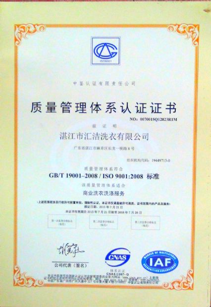 湛江市匯潔洗衣有限公司創建于1995年6月,是目前粵西地最大規模的專業洗滌服務公司,是中國洗染聯合會常務理事單位、廣東省洗滌協會“四星級”會員企業(公司董事長李康明先生現任該協會副會長),湛江市消費委員會“和諧消費信譽單位”,公司取得“ISO9001國際質量管理體系認證”“ISO45001職業健康安全管理體系認證”“ISO14001環境體系管理認證”。公司資質標準被廣東省洗染行業協會認證為“商業布草洗滌A級”。公司座落于湛江市麻章工業區內,占地面積13400平方米。