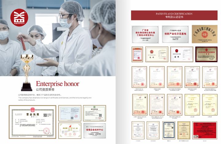 國家高新技術企業、廣東省省級企業技術中心、廣東省微生物發酵紅曲色素工程技術研究中心、等10多項和20多項發明專利,是中國食品添加劑和配料協會理事單位和中國生物發酵產業等協會會員單位。通過了ISO22000食品安全管理體系認證、誠信管理體系等認證。