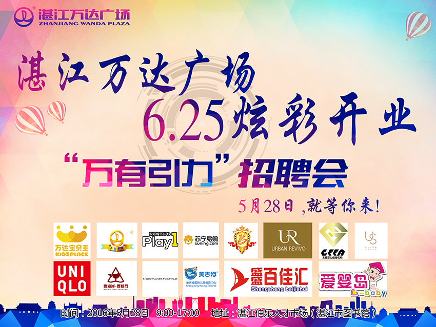 湛江萬達廣場商業物業管理有限公司攜手萬達廣場入駐品牌商家于5月28日在湛江伯樂人才市場舉辦“萬有引力”大型專場招聘會。在萬達,就沒有不可能!這里,有美好的開始,有屬于你的位置,挑戰自己,展現自我,從現在開始!本次招聘會近100家知名商家,2000多個高薪崗位等你來!更多的國內外知名商家在招聘會現場等著你哦!如果你錯過了4月16號萬達專場招聘會,5月28號不要再錯過了哦,來吧!