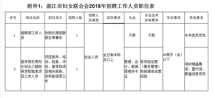 因工作需要,湛江市婦女聯合會決定面向社會公開招聘2名合同制工作人員(非編制),現將公開招聘的有關事項公告如下: