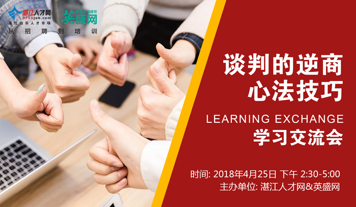 4月25日下午2:30湛江人才網在湛江伯樂人才市場舉辦《談判的逆商心法技巧》學習交流會,本次交流會夏東豪老師帶來談判的逆商心法技巧,系統分享行之有效的商務談判策略,以及常見談判問題的應對方法,幫助學員提升商務談判能力,通過對談判全程的掌控,越過談判障礙,有效實現談判目標,從而幫助企業及員工提升銷售業績,增強銷售和業務人員綜合軟實力!