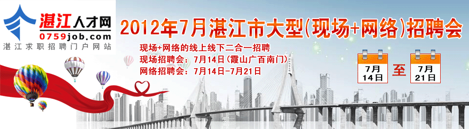 地址:湛江市赤坎區體育北路6號君臨世紀廣場5號樓2層02號商鋪  郵編:524000  郵箱:0759@0759job.com  中文網址:湛江人才網.com